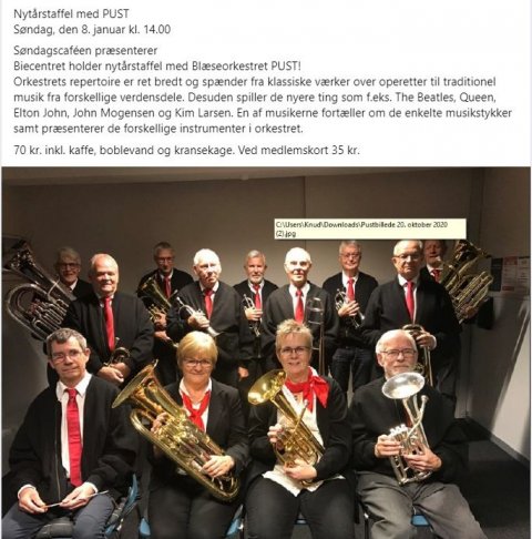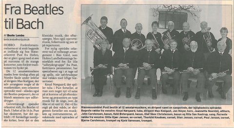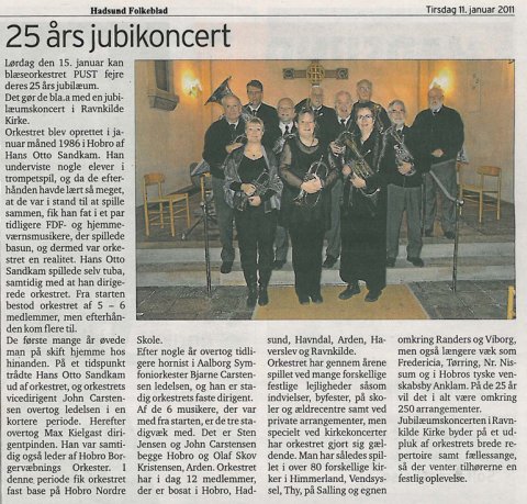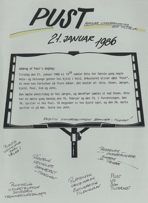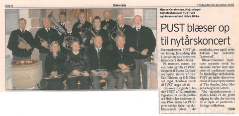 I PUST's scrapbog berettes om starten den 21. januar 1986. Hvad står bogstaverne PUST egentligt for? Der kom mange gode forslag.  I 1986 fik PUST moderigtige "ude"-uniformer.  Er man PUST'er, skal man have en "blæser" på. 1986  Også i 1989 blev der spillet flot kirkemusik. Her i Haverslev Kirke.  I forbindelse med sommerfest i Valsgaard er PUST helt oppe at køre. Året er 1992.  PUST underholder i Ravnkilde forsamlingshus i 1996. Her den "tynde" side.  Avisen fortæller i 2002 om de 12 amatørmusikere i PUST.  I anledning af julen 2003 musiceres der på Torvet i Mariager. Uden for billedet danser nisserne om træet.  I 2003 blæser PUST op til nytårskoncert i Hobro Kirke.  Hadsund Folkeblad beretter i 2011 om PUST's 25 års jubilum.  PUST får megen ros efter at have leveret meget velklingende musik ved musikgudstjeneste i Sindal Bykirke i august 2012. Foto: Marianne Jakobsen.  Maj 2013 så besætningen således ud ved koncert i Aalestrup Kirke.  PUST i Ravnkilde Kirke marts 2014.  Nytårskoncert i Hobro Kirke 3. januar 2015.  Nytårsgudstjeneste med efterfølgende koncert i Hadsund Kirke 03.01.2016. Foto Hanne Vestergaard  PUST, Hadsund Kirke 03.01.2016. Foto Hanne Vestergaard  Nytårstaffel i Biecentret, Hobro